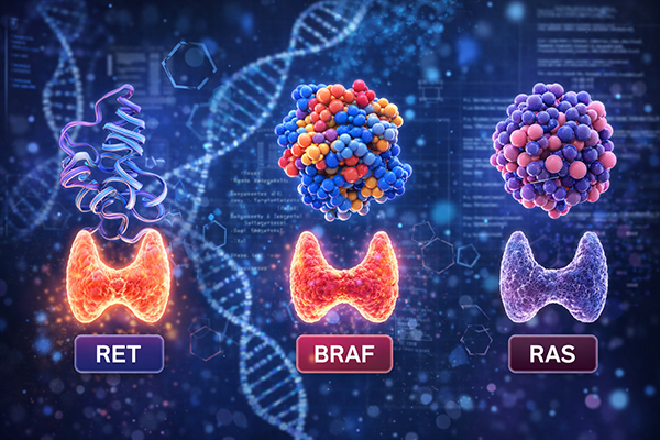 Printre cele mai importante mutații implicate în cancerul tiroidian se numără RET, BRAF și RAS. Acestea sunt considerate markeri moleculari esențiali, deoarece pot indica tipul histologic al tumorii, gradul de agresivitate și pot orienta deciziile terapeutice.